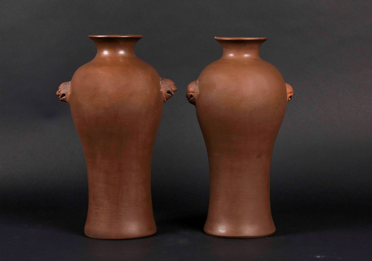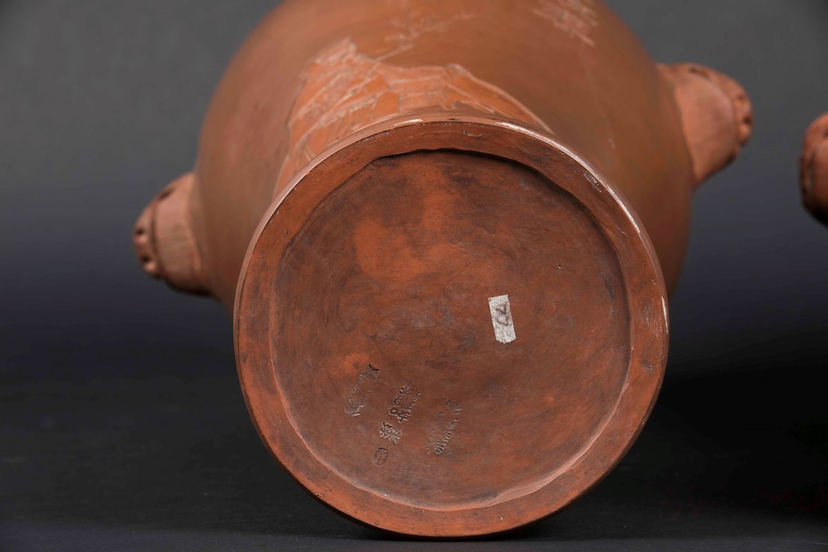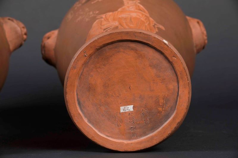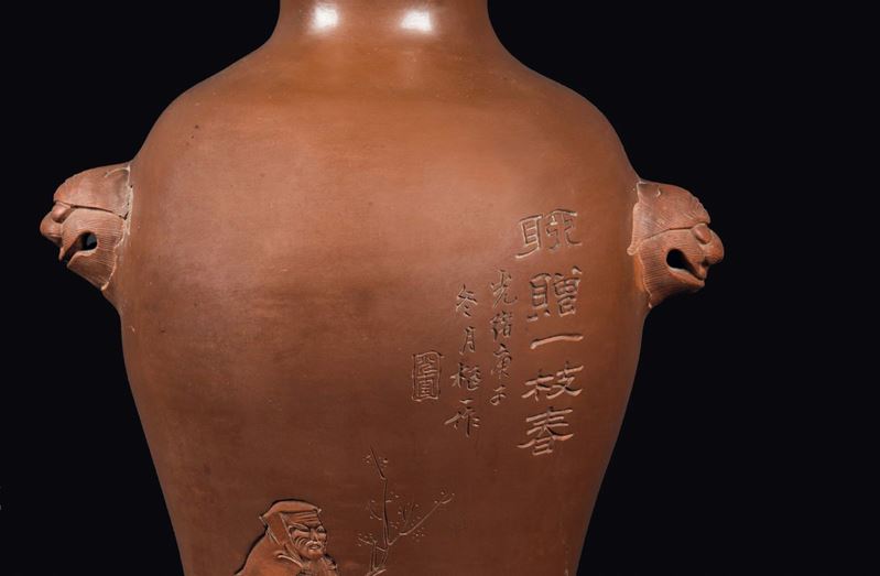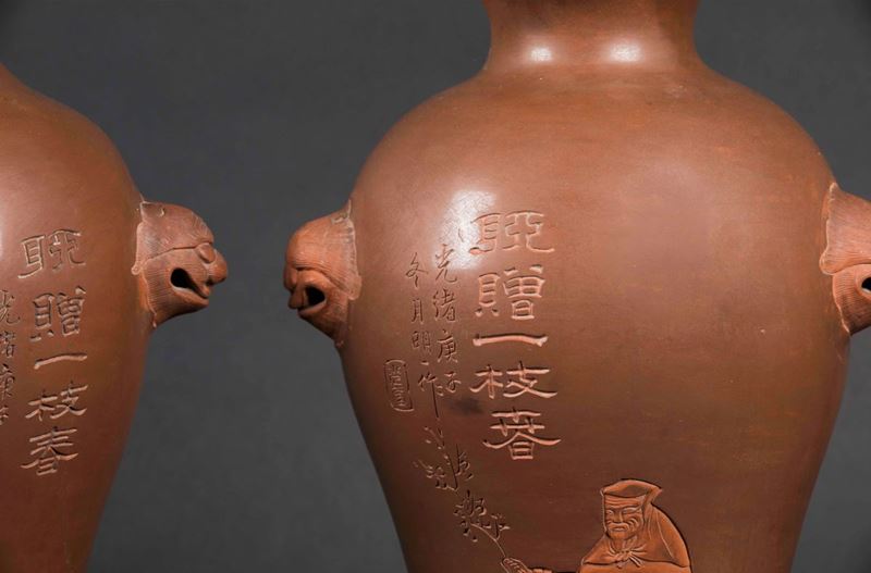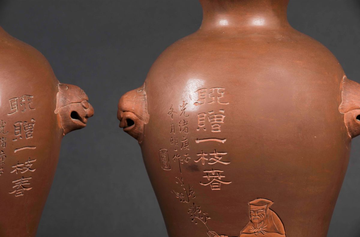 A pair of monochrome grès vases with figures of travellers and inscriptions, China, Yixing production, 19th century