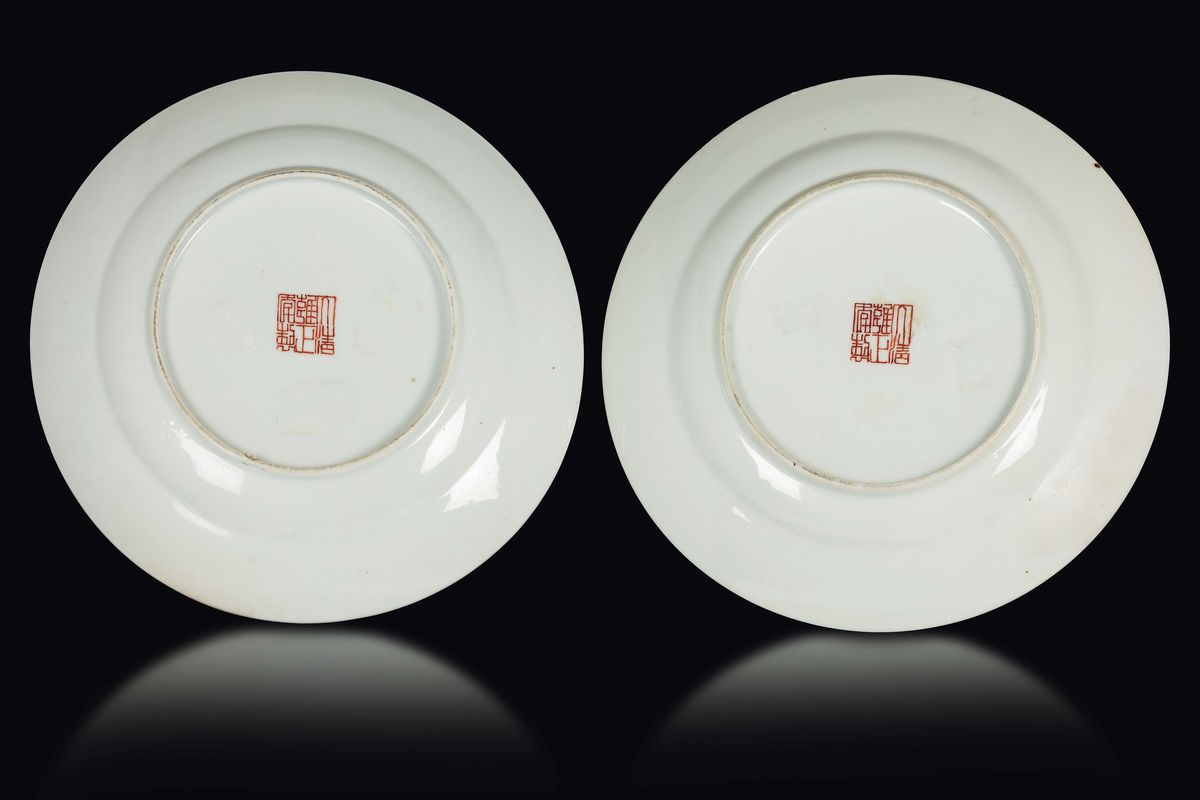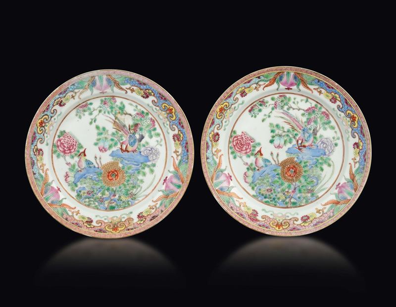 A pair of Pink Family porcelain plates with botanical scenes, China, Qing Dynasty, 19th century