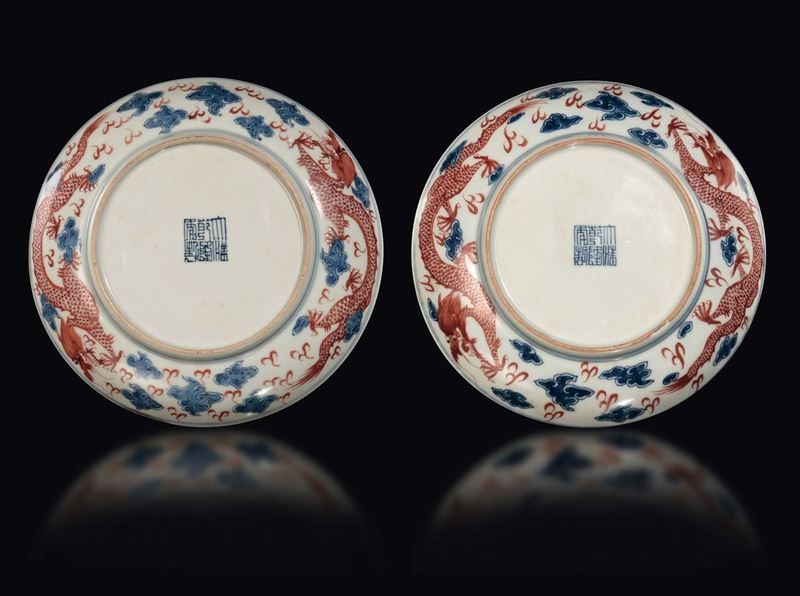 A pair of porcelain plates with blue and red dragons, China, Qing Dynasty, 19th century