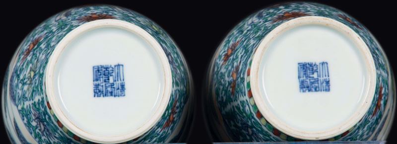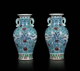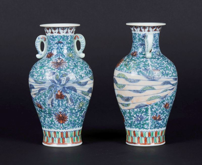 A pair of small double-handled doucai porcelain vases with a central ribbon decor, China, Qing Dynasty, 20th century
