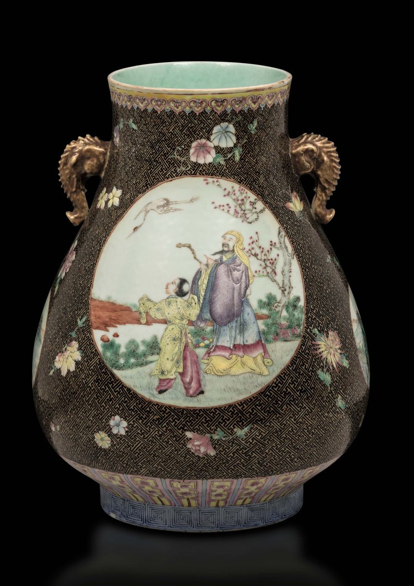 A polychrome glazed porcelain vase with wisemen and children with geese, China, Qing Dynasty, late 19th century