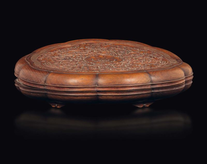 A polylobe box in carved huanguali wood with a central flower and a cloud motif, China, Qing Dynasty, Qianlong period (17 [..]