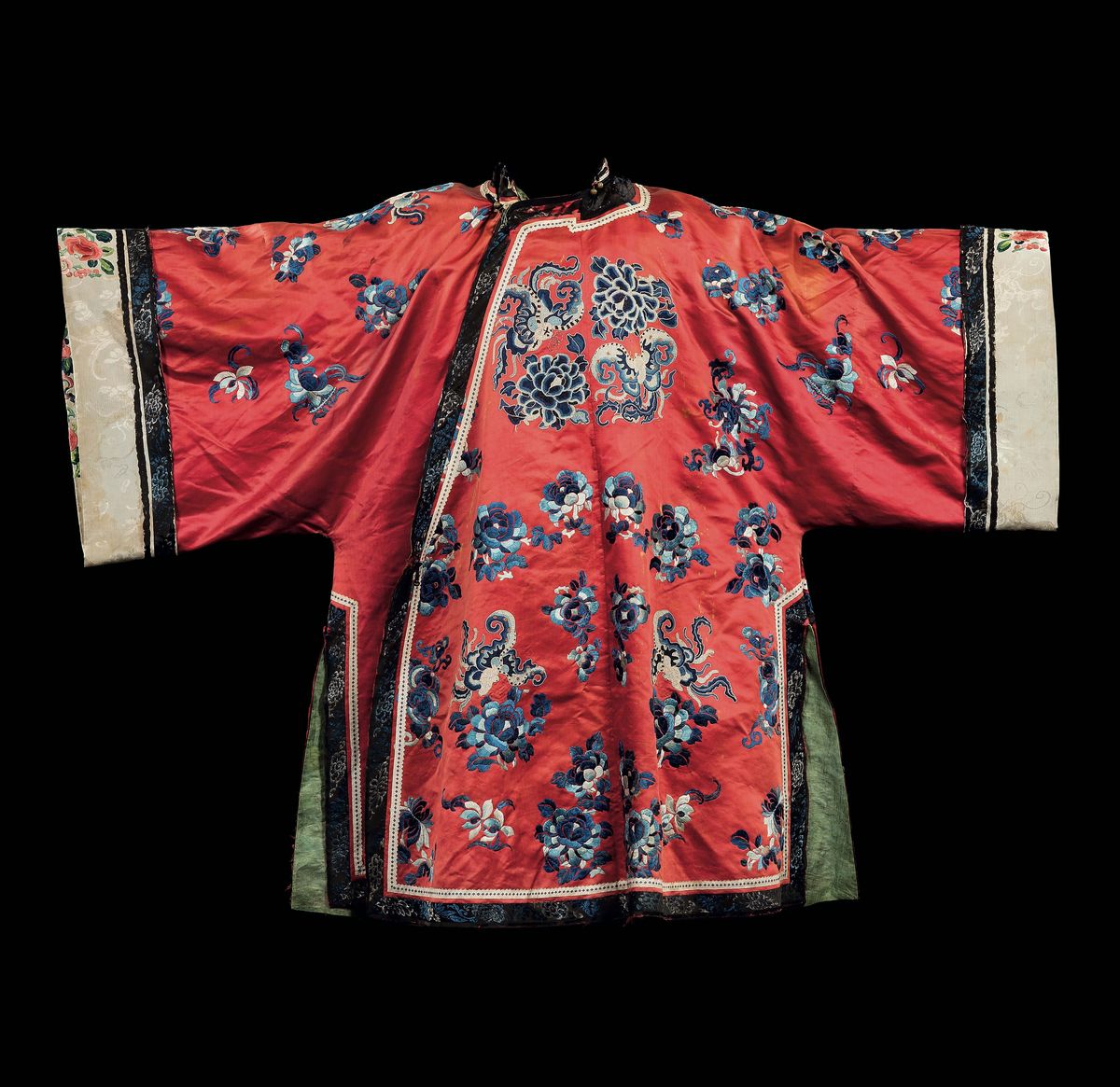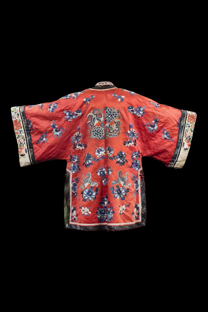 A red-ground silk dress embroidered with floral decors, China, Qing Dynasty, early 20th century