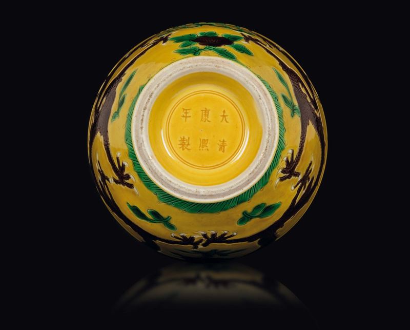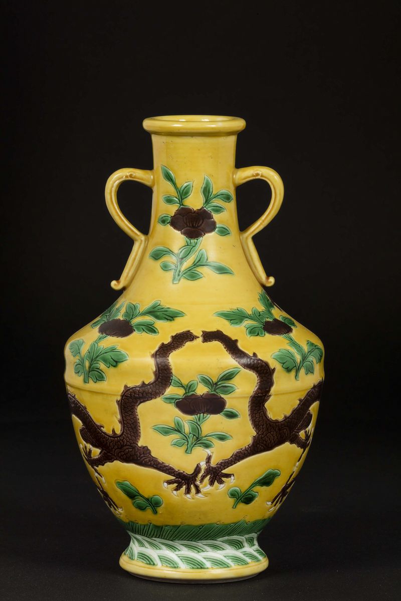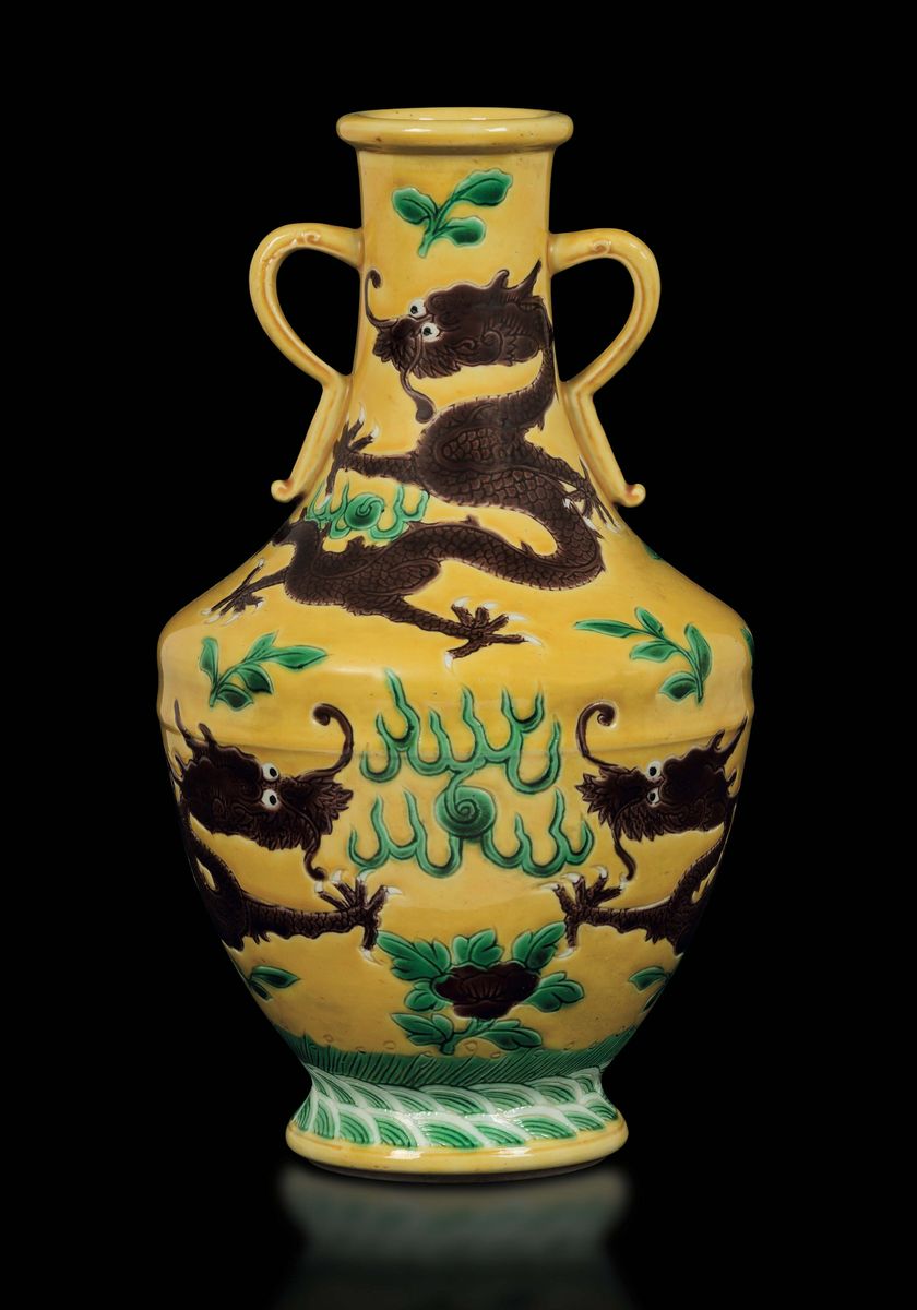 A Sancai enamelled porcelain vase with handles, with a decor of dragons among the clouds and naturalistic elements, China, [..]