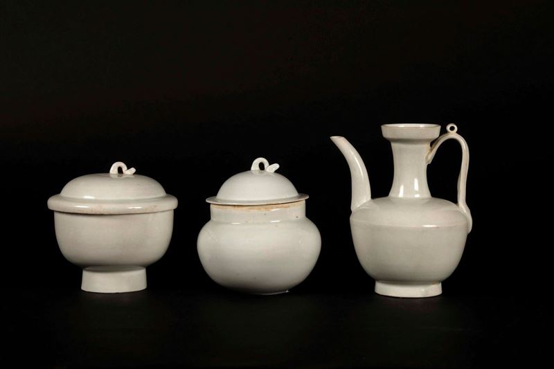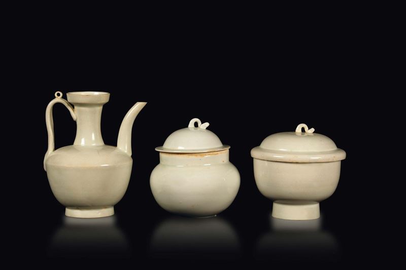 A small Ching Te Chen Chun Shan porcelain pitcher and two bowls, Song Dinasty (960-1279)