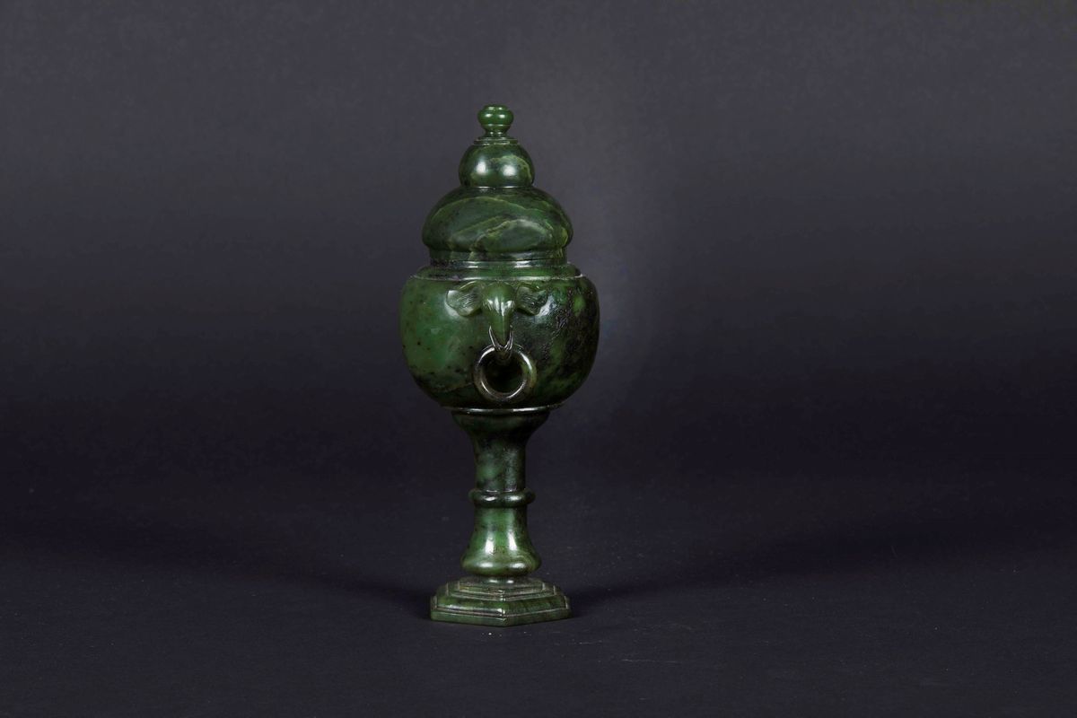 A spinach jade vase with lid, with elephant heads and ring handles, China, Qing Dynasty, 19th century