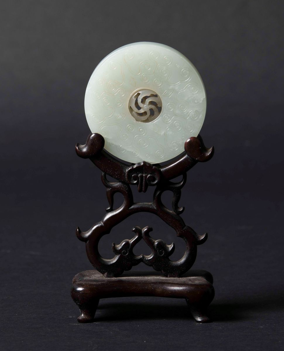 A white jade Bi disk with an engraved decor and swiveling central medallion, China, Qing Dynasty, 19th century