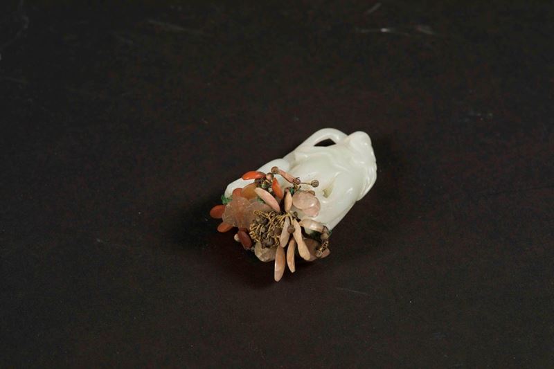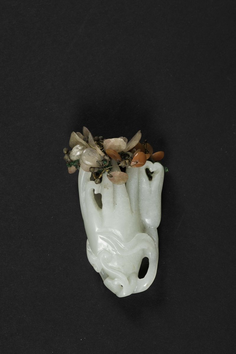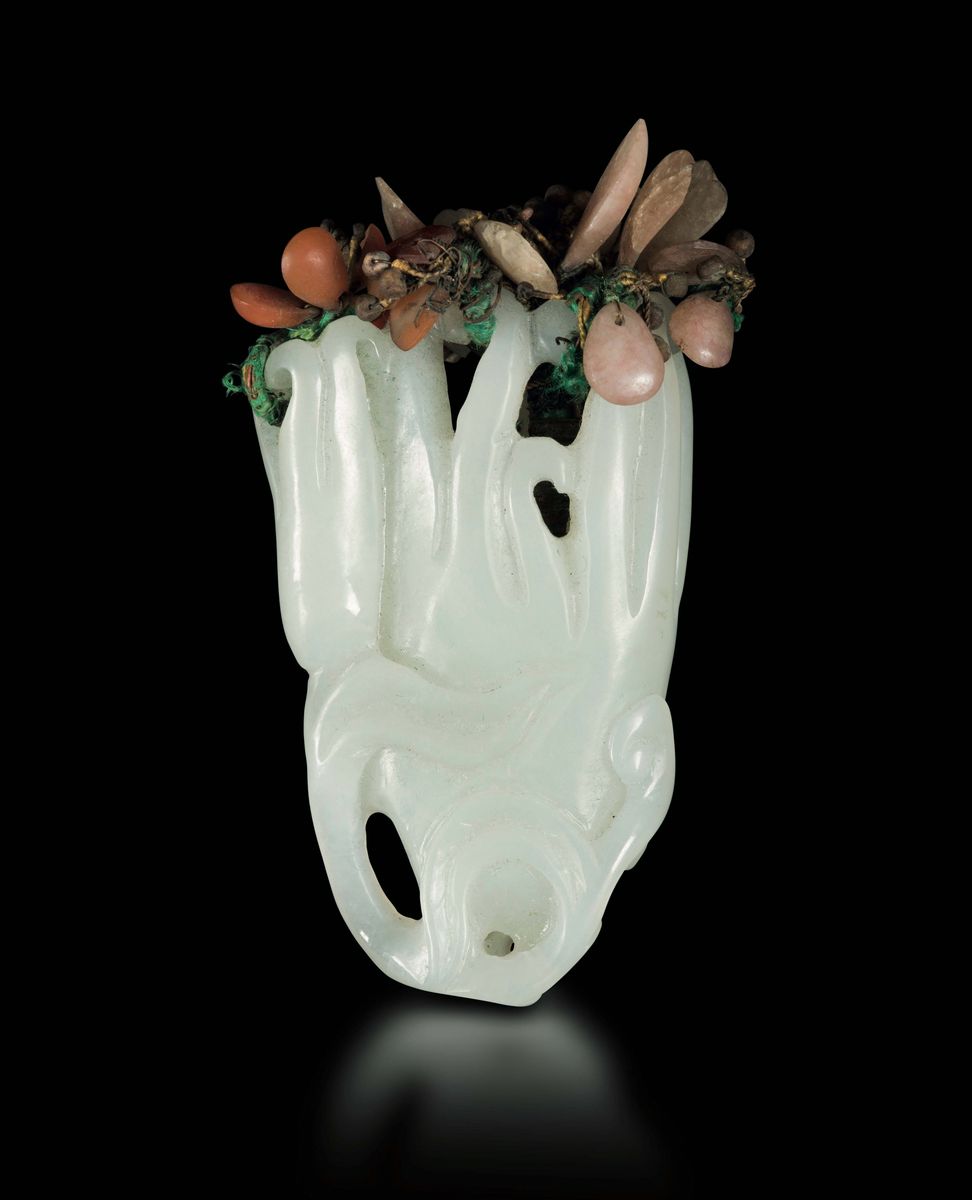 A white jade Buddha hand with semiprecious stone applications, China, Qing Dynasty, late 19th century