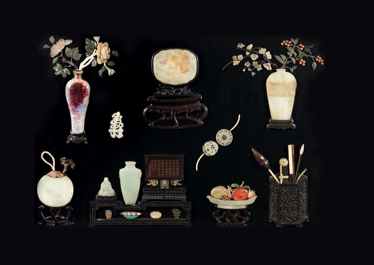 An important homu wood screen with applications in jade, ivory mother-of-pearl, porcelain, China, Qing Dynasty, 19th century
