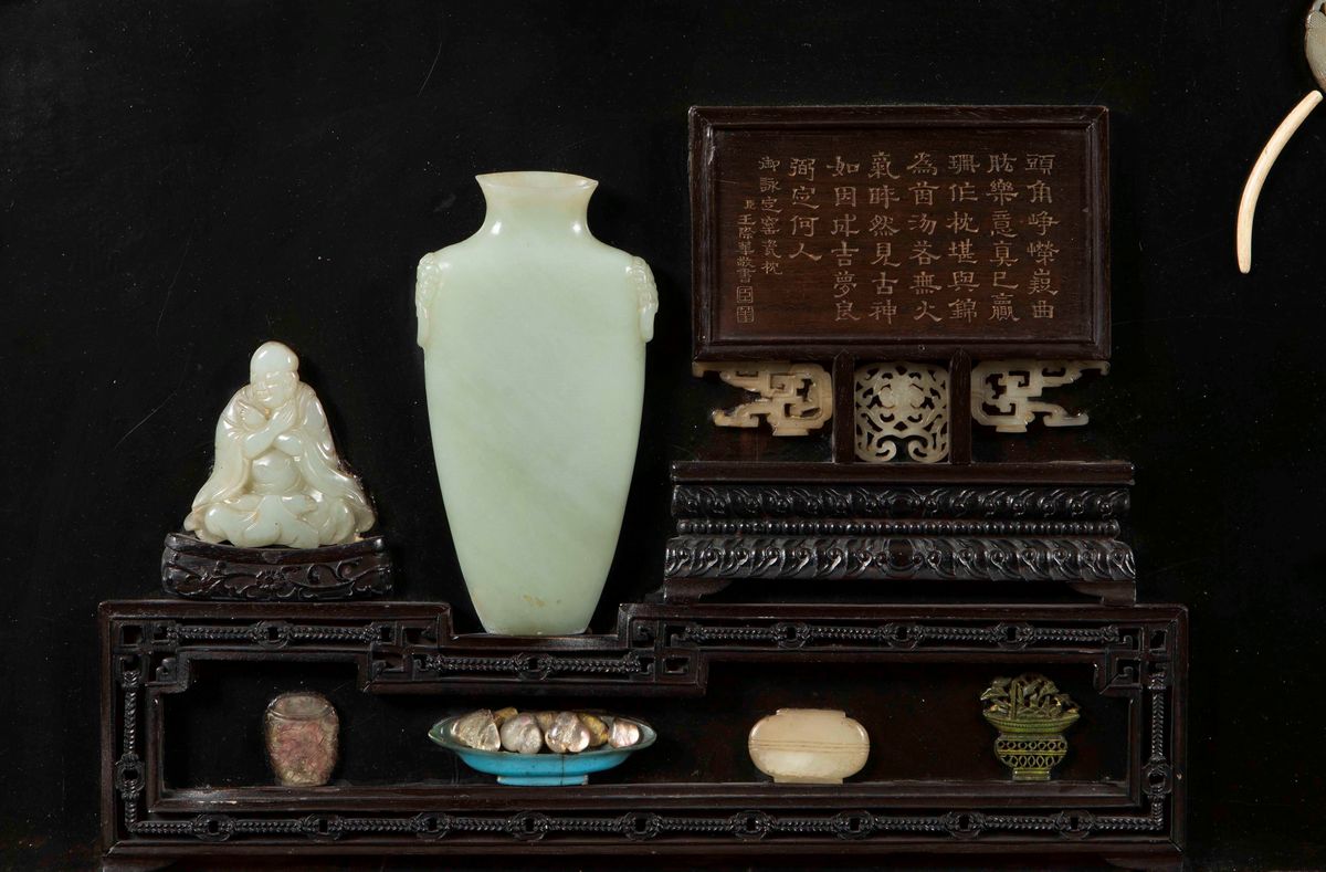 An important homu wood screen with applications in jade, ivory mother-of-pearl, porcelain, China, Qing Dynasty, 19th cent [..]