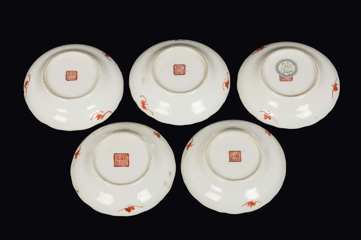 Five small polychrome enamel porcelain plates with views of cities, villages and inscriptions, China, Qing Dynasty, 19th [..]