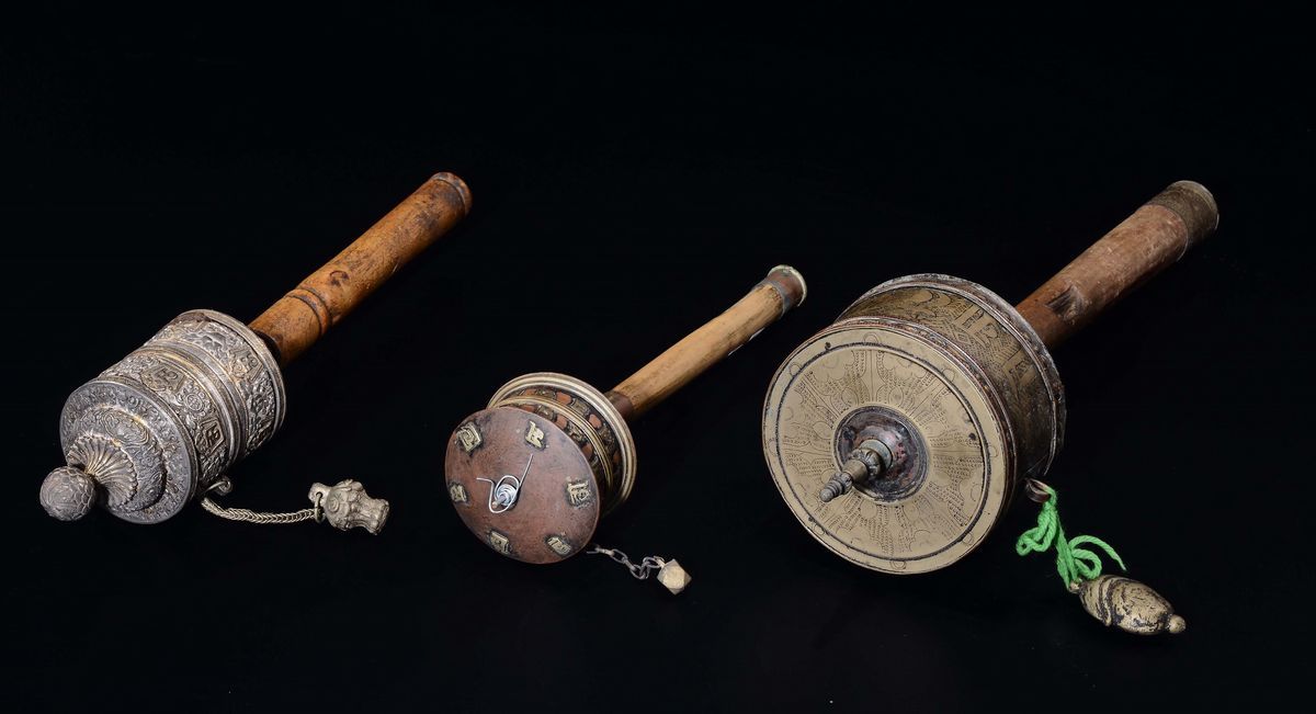 Six copper prayer wheels with semi-precious stone inlays, Tibet, 19th century