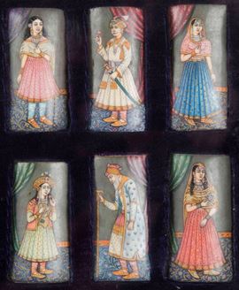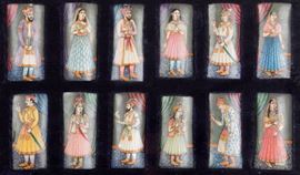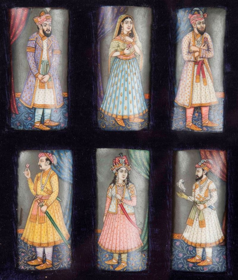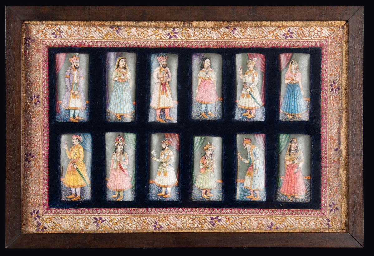 Twelve painted ivory plaques depicting Mogul emperors and their wives within a frame, India, 19th century