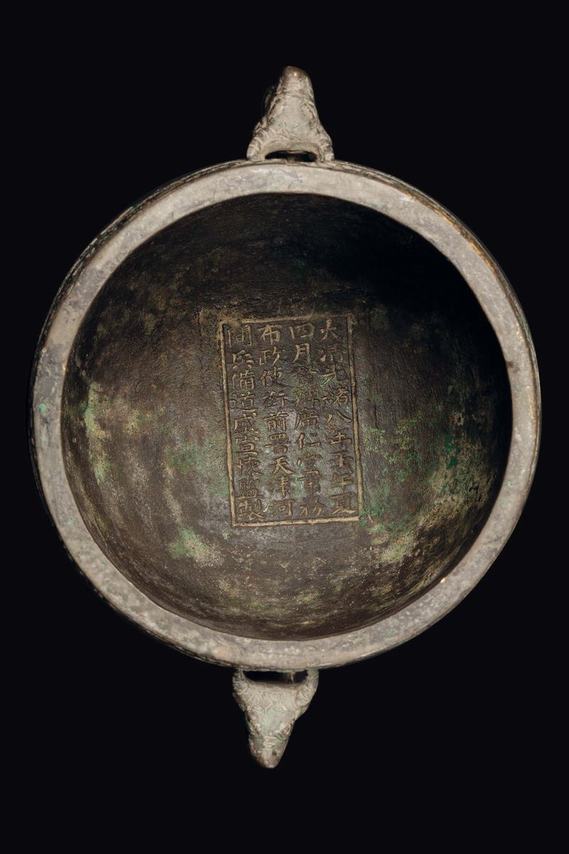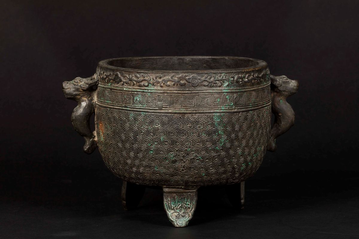 A bronze censer with geometric motifs and dragon head handles, China, Qing Dynasty, Guangxu period (1875-1908)