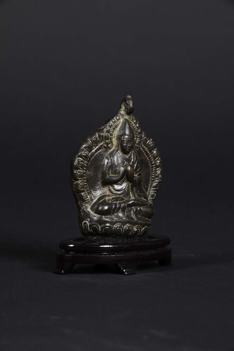 A bronze pendant depicting Lama seated on a lotus flower, Tibet, 13th-14th century