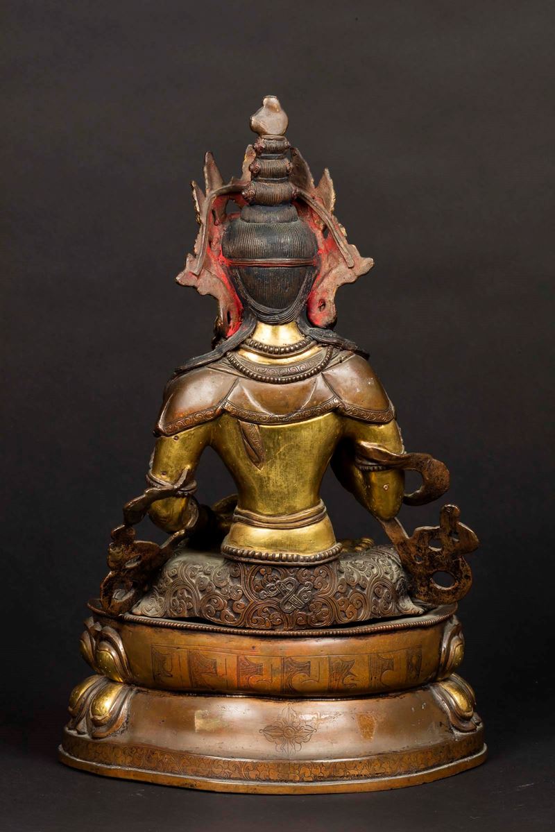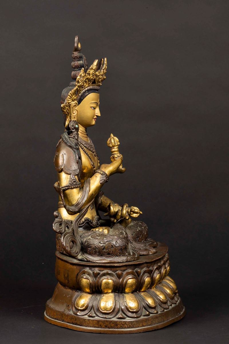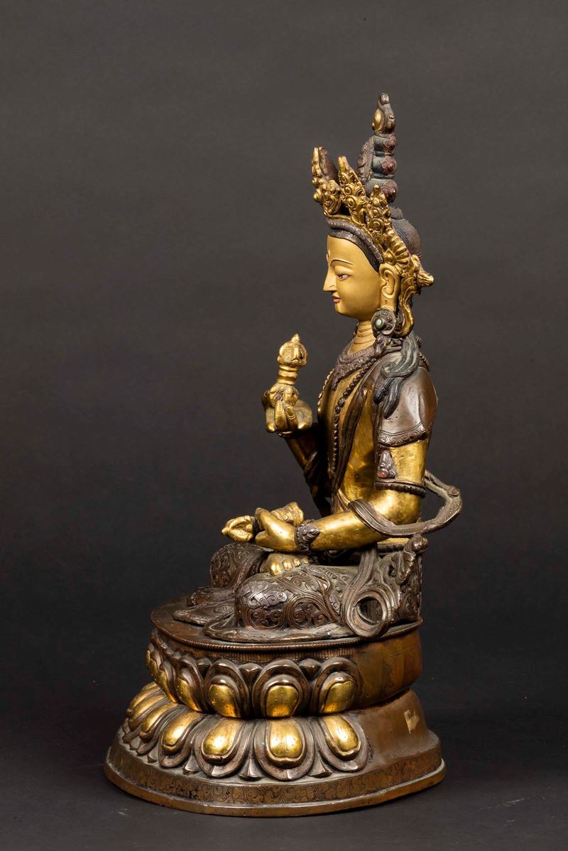 A gilt and burnished bronze figure of Amitayus seated on a double lotus flower holding ritual items, Tibet, 19th century