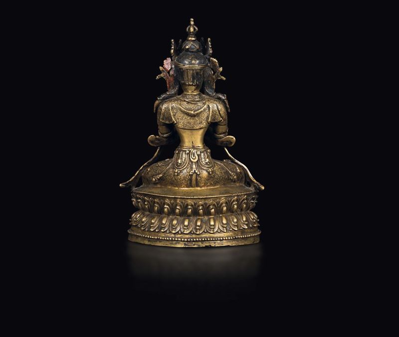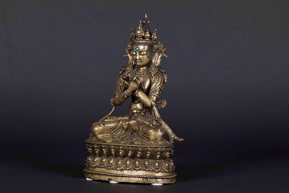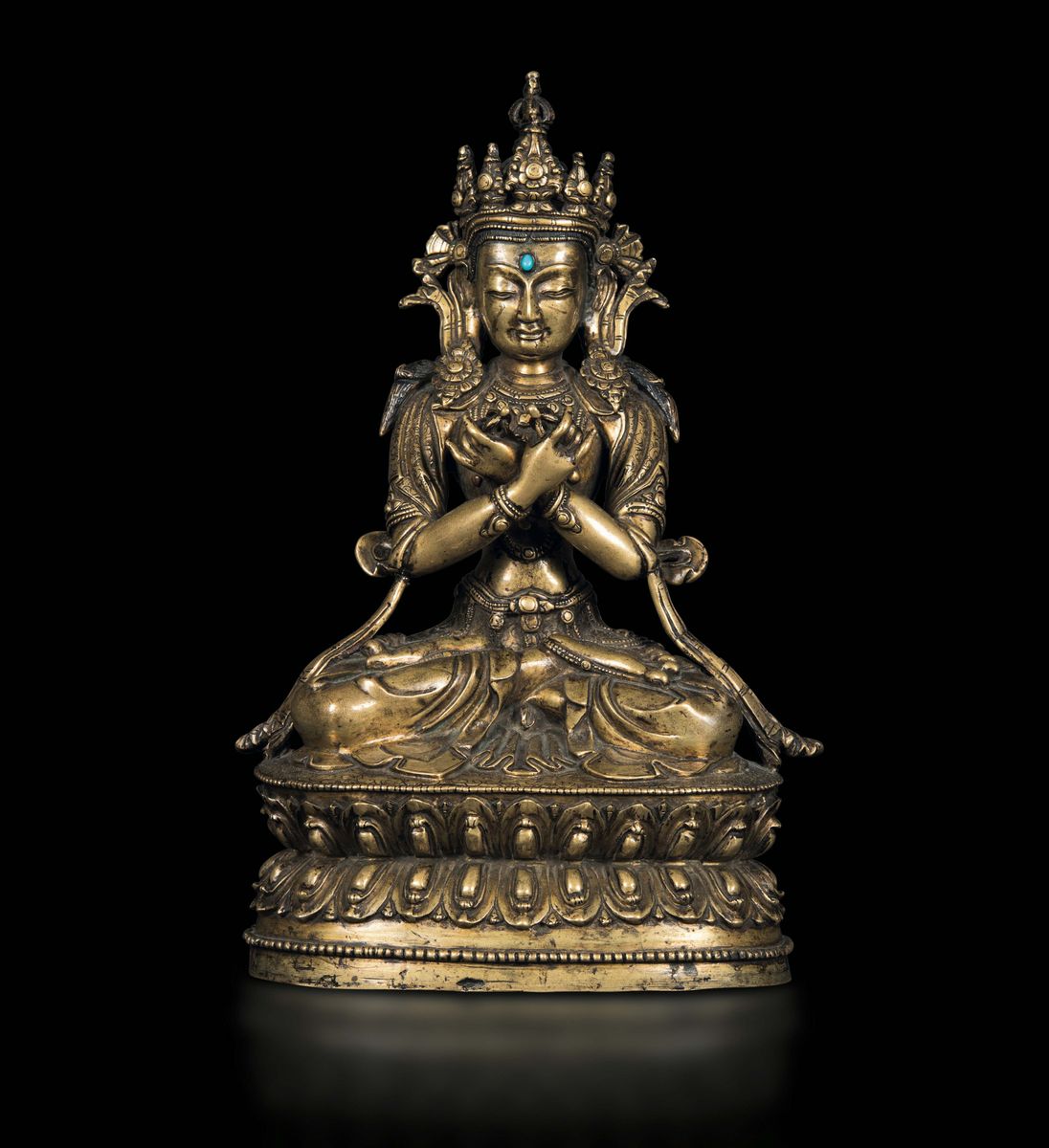 An important gilt bronze sculpture with a turquoise inlay depicting Vajradhara seated on a double lotus base, Central Tibet, [..]
