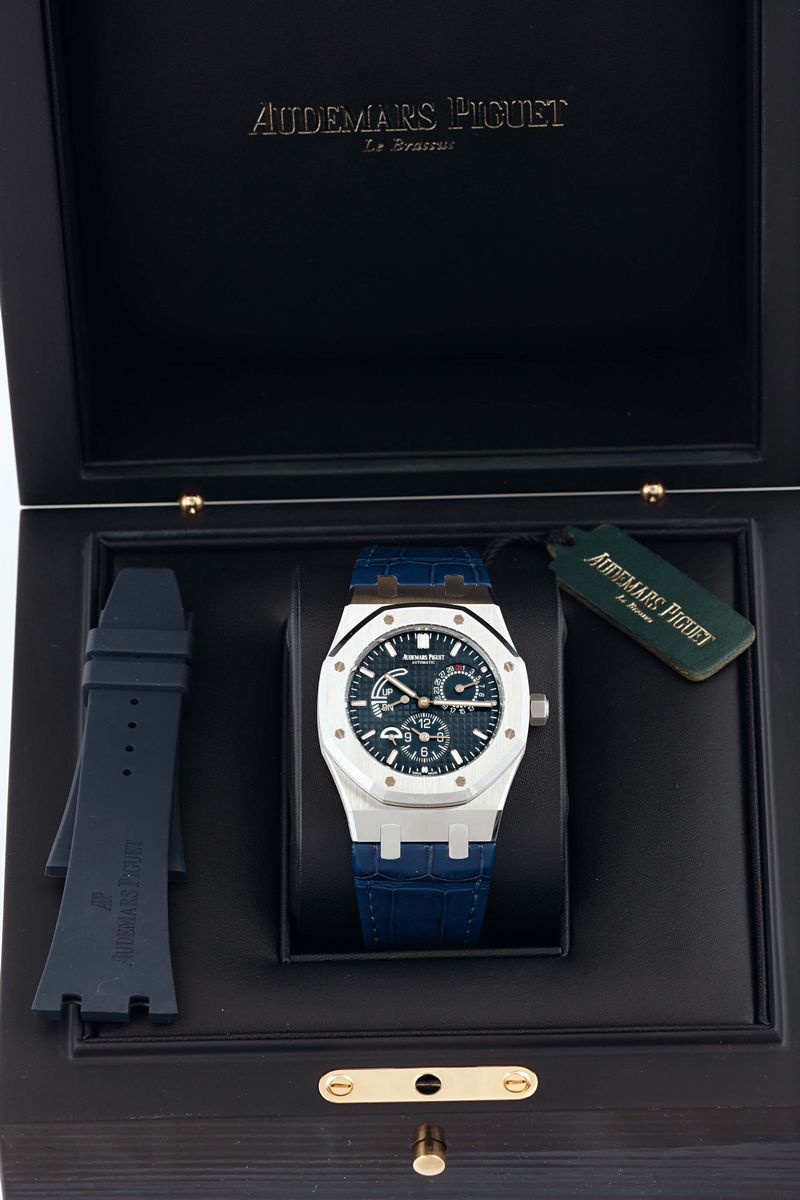 Audemars Piguet, Royal Oak Dual- Time Automatic, Ref. 26124ST. Very fine, octagonal, two time zone, self-winding, water resistant, stainless steel wristwatch with date, power reserve, day/night indication and a stainless steel Audemars Piguet deployant clasp. Accompanied by fitted box, Guarantee, additional rubber strap and booklet. Sold in 2017