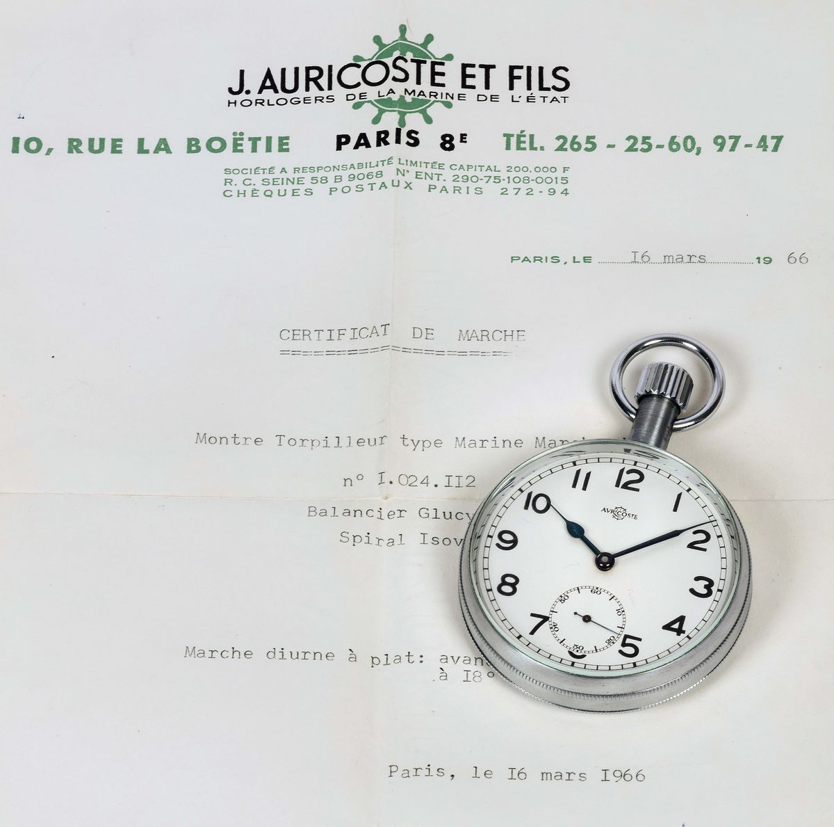 AURICOSTE, movement No. 1024112. Fine, large and rare, steel destroyer war clock. Made circa 1940. Accompanied by the originale [..]