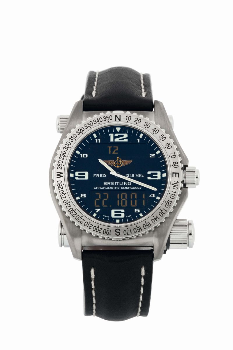 Breitling, Genève, Emergency, Chronometre, Ref. E76321. Fine and unusual, water-resistant, titanium aviator's quartz Chronometer wristwatch with digital display for the chronograph, perpetual calendar with date, day, month and year, world time indication, alarm, micro antenna with aviation emergency frequency 121.5 MHz with an original steel buckle. Accompanied by the original box, additional titanium bracelet, papers, Guarantee, overhaul document, Certificate, instruction booklet and tools. Sold in 2005