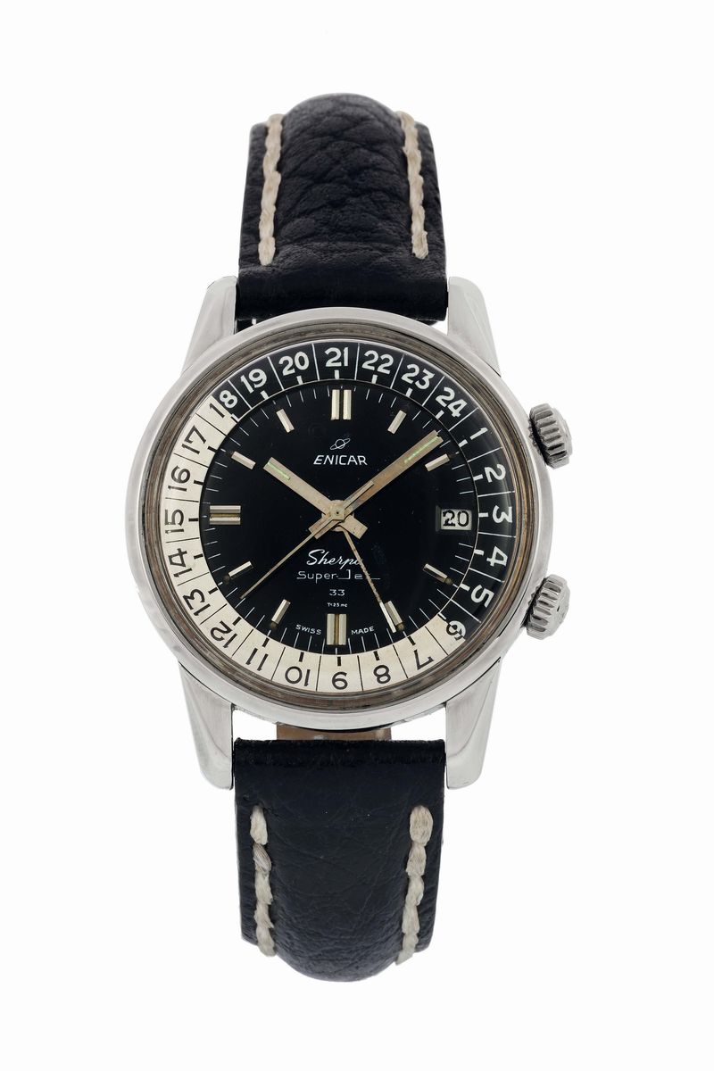 ENICAR, Super Jet 33, Seapearl, GMT, fine, water resistant, stainless steel wristwatch with date and two crowns. Made circa [..]
