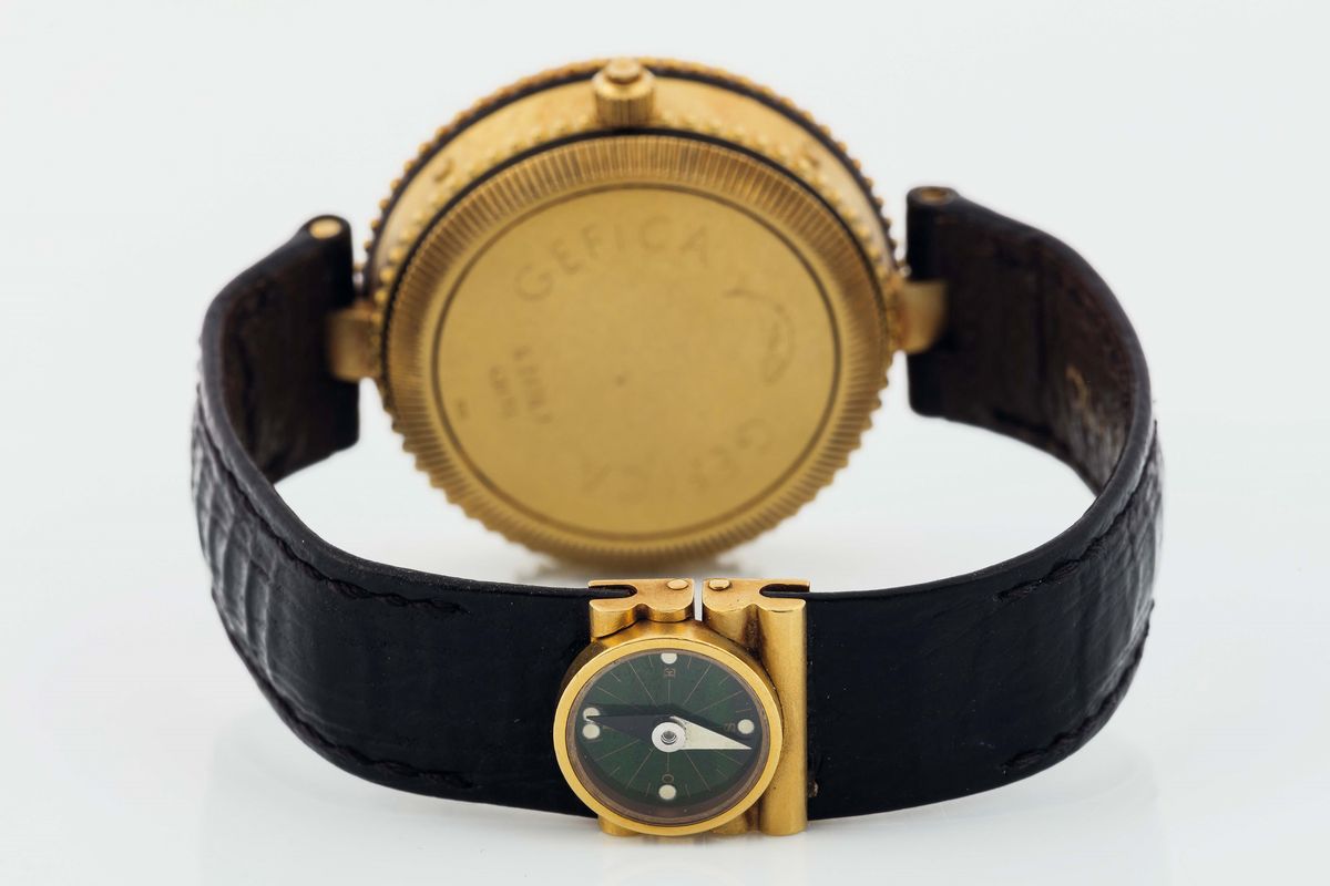 Gérald Genta, Gefica, case No. 43414, Ref. G 2776.7. Fine, astronomic, two time zone, water-resistant, yellow gold and malachite [..]