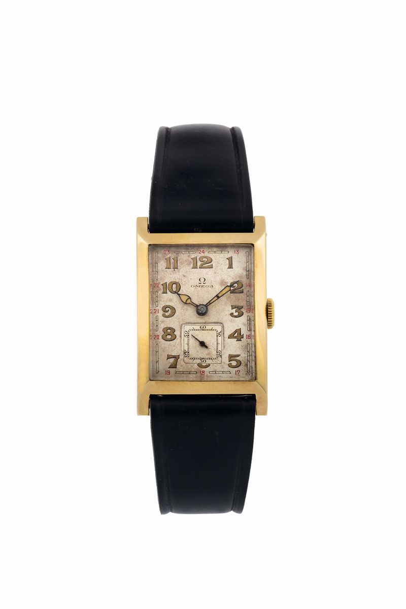Omega,Art Decò, movement No. 6984437. Fine, rectangular, 14K yellow gold wristwatch with original gold plated buckle. Made [..]