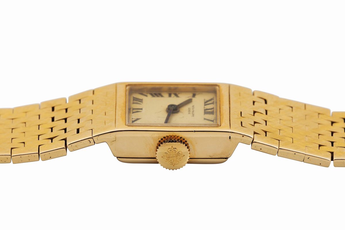 Patek Philippe & Cie, Genève, case No. 2620951, Ref. 3285 / 21. Fine, square, 18K yellow gold lady's wristwatch with an integrated 18K yellow gold Patek Philippe textured bracelet. Made in the 1970's