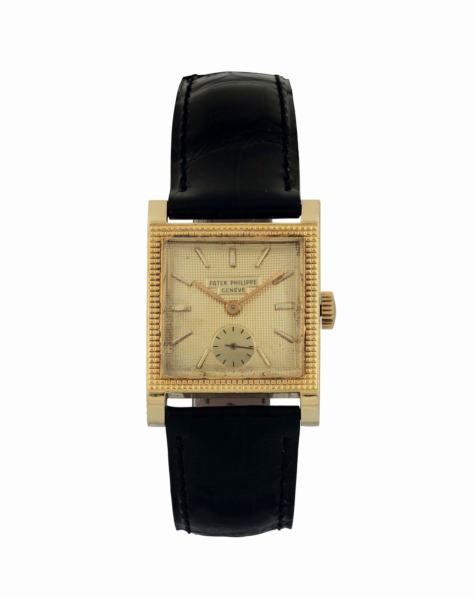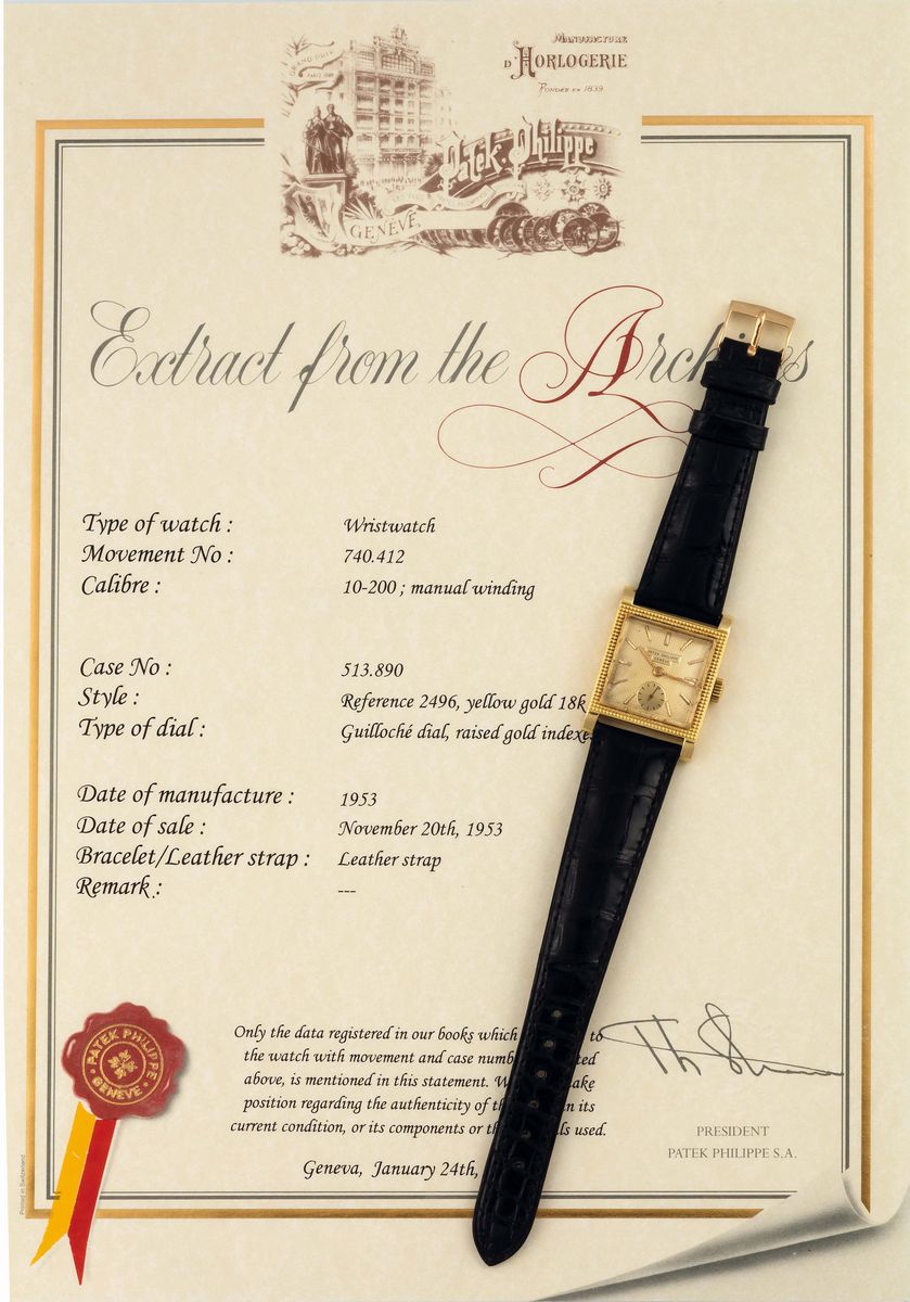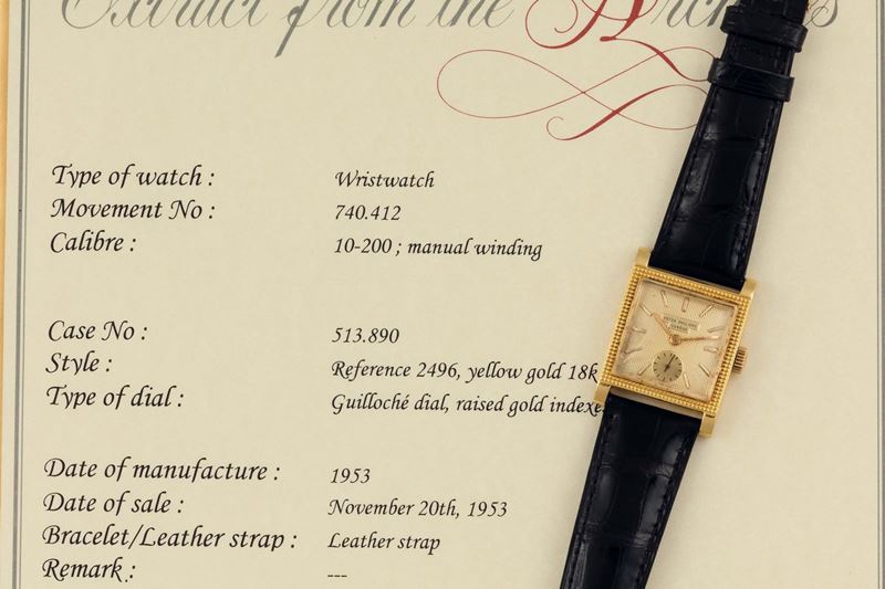 PATEK PHILIPPE, Geneve, case No. 513890, REF. 2496 Very fine and rare, square, 18K yellow gold wristwatch with gold buckle. Made in 1953. Accompanied by the original Extract
