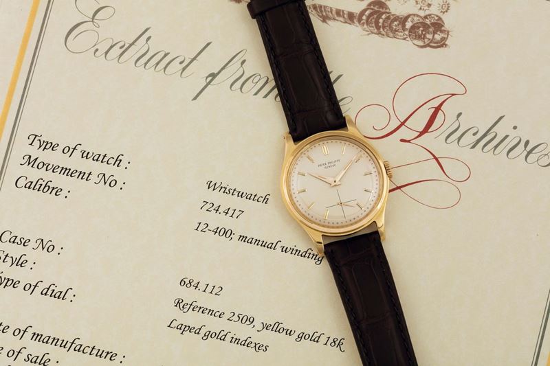 Patek Philippe, Genève, movement No.724417, case No. 684112, Ref. 2509. Very fine and rare, water-resistant, 18K yellow gold wristwatch. Accompanied by the original Extract. Made in 1954