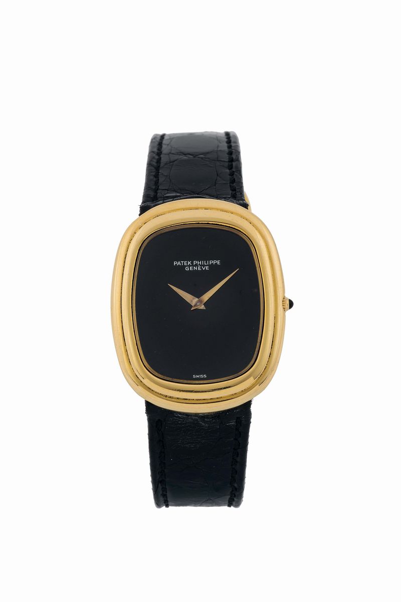 PATEK PHILIPPE, Genéve, Ref. 3630 J. Fine and rare, 18K yellow gold ellipse shaped wristwatch with original gold buckle. Made circa 1970