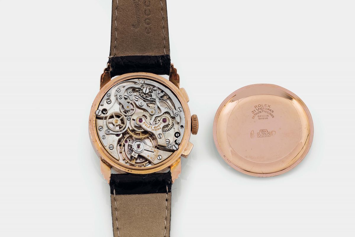 ROLEX, Chronographe, Antimagnetique, Ref.3835. A very rare and unusual, 18K pink gold chronograph wristwatch with tachometer, [..]