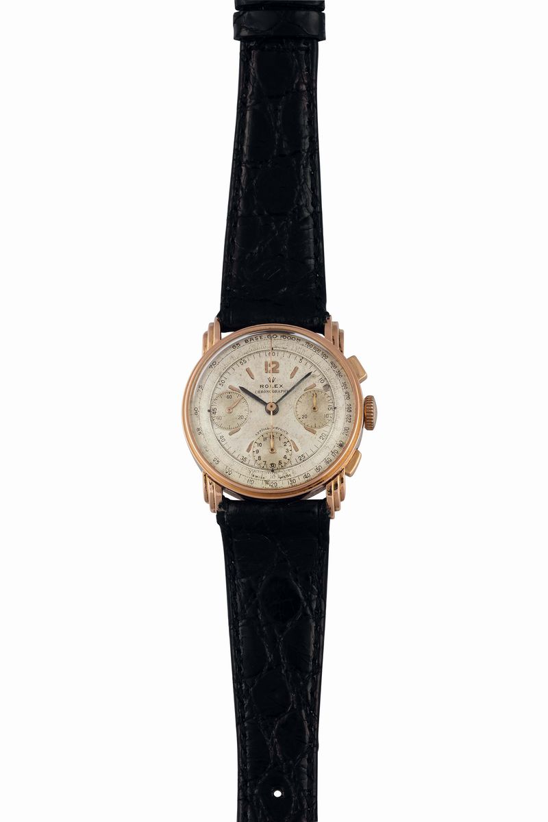 ROLEX, Chronographe, Antimagnetique, Ref.3835. A very rare and unusual, 18K pink gold chronograph wristwatch with tachometer, telemetre and triple-stepped lugs and a gold Rolex buckle. Made circa 1940