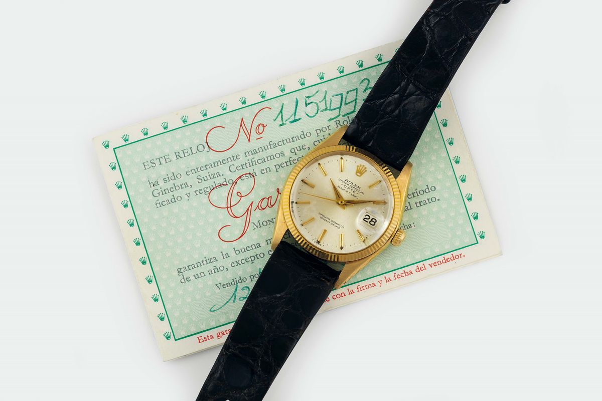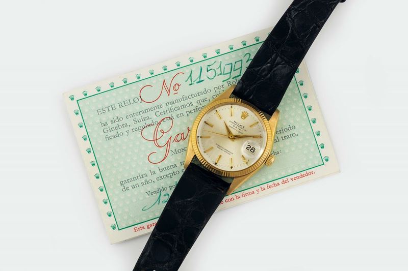 Rolex, Oyster Perpetual, Date, SERPICO Y LAINO, Superlative Chronometer, Officially Certified, case No. 1151993, Ref. 1503. Fine, center seconds, self-winding, water-resistant, 18K yellow gold wristwatch with date Accompanied by a Rolex box, Cosc Certificate and Guarantee. Sold in 1967