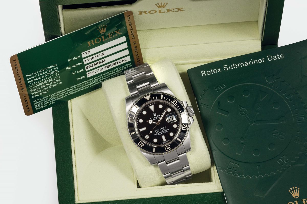 ROLEX, Oyster Perpetual SUBMARINER,Superlative Chronometer Officially Certified REF. 116610. A fine, self-winding stainless steel divers wristwatch with ceramic bezel date and an original Rolex Oyster bracelet with deployant clasp. Accompanied by the original box, Guarantee and booklet. Sold in 2012