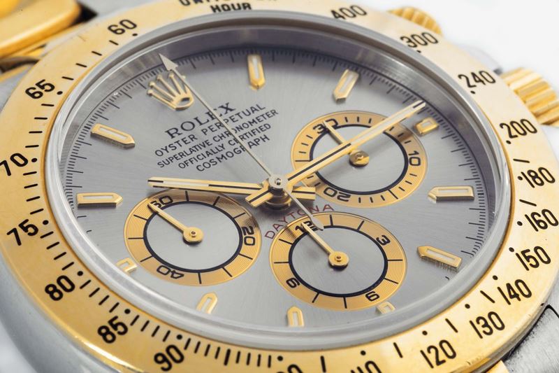 ROLEX, Oyster Perpetual, Superlative Chronometer, Officially Certified, Cosmograph, Daytona, case No. A177515, Ref. 16523. Very fine, water-resistant, self- winding, stainless steel and 18K yellow gold wristwatch with round button chronograph, registers, tachometer and a stainless steel and 18K yellow gold Rolex Oysterlock bracelet with deployant clasp. Accompanied by the original fitted box, papers and Guarantee. Made circa 1999