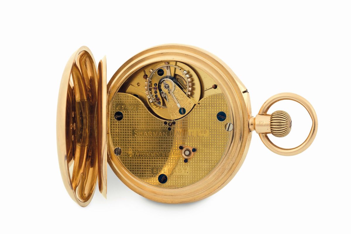 Sharman D. Neill’, Belfast, 18K yellow gold, hunting case pocket watch with caroussel movement. Made circa 1880