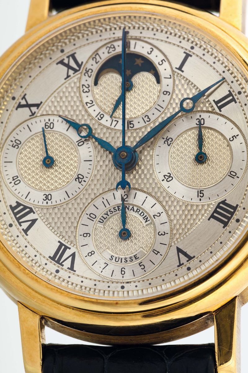 ULYSSE NARDIN, SPLIT CHRONOGRAPH, extremely rare, 18K yellow gold wristwatch with moon phase and an original gold buckle. Made circa 1990