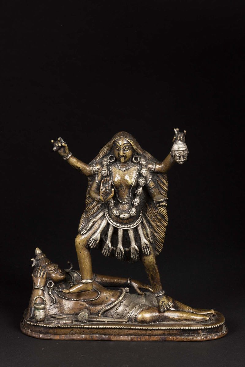 A bronze sculpture with silver inserts depicting a dancing deity, India, 19th century