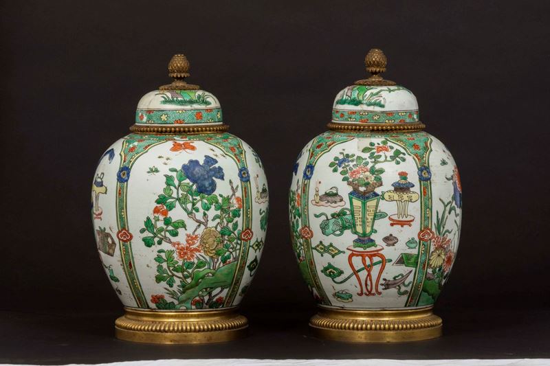 A pair of Green Family porcelain potiches with gilt bronze mountings, China, Qing Dynasty, late 19th century