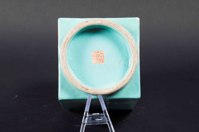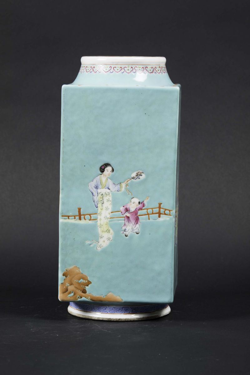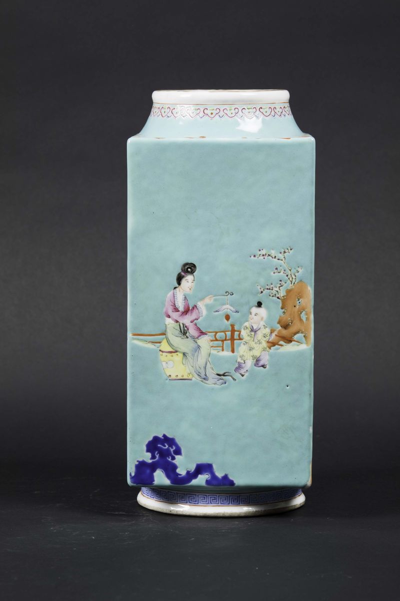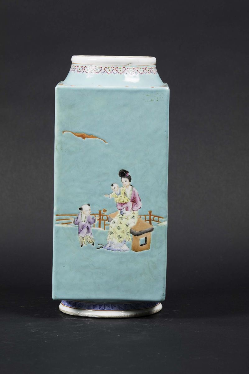A polychrome enamel porcelain vase with figures of Guanyin and children on a turquoise backdrop, China, Qing Dynasty, 20th [..]