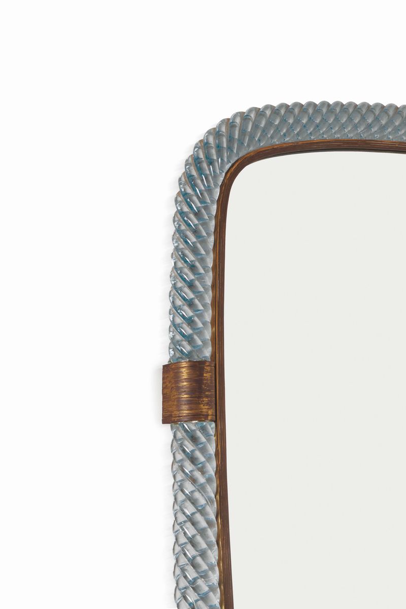 Venini, a mod. 20 mirror with a wooden and mirrored glass structure. Treccia glass and polished brass frame. Venini Prod., [..]
