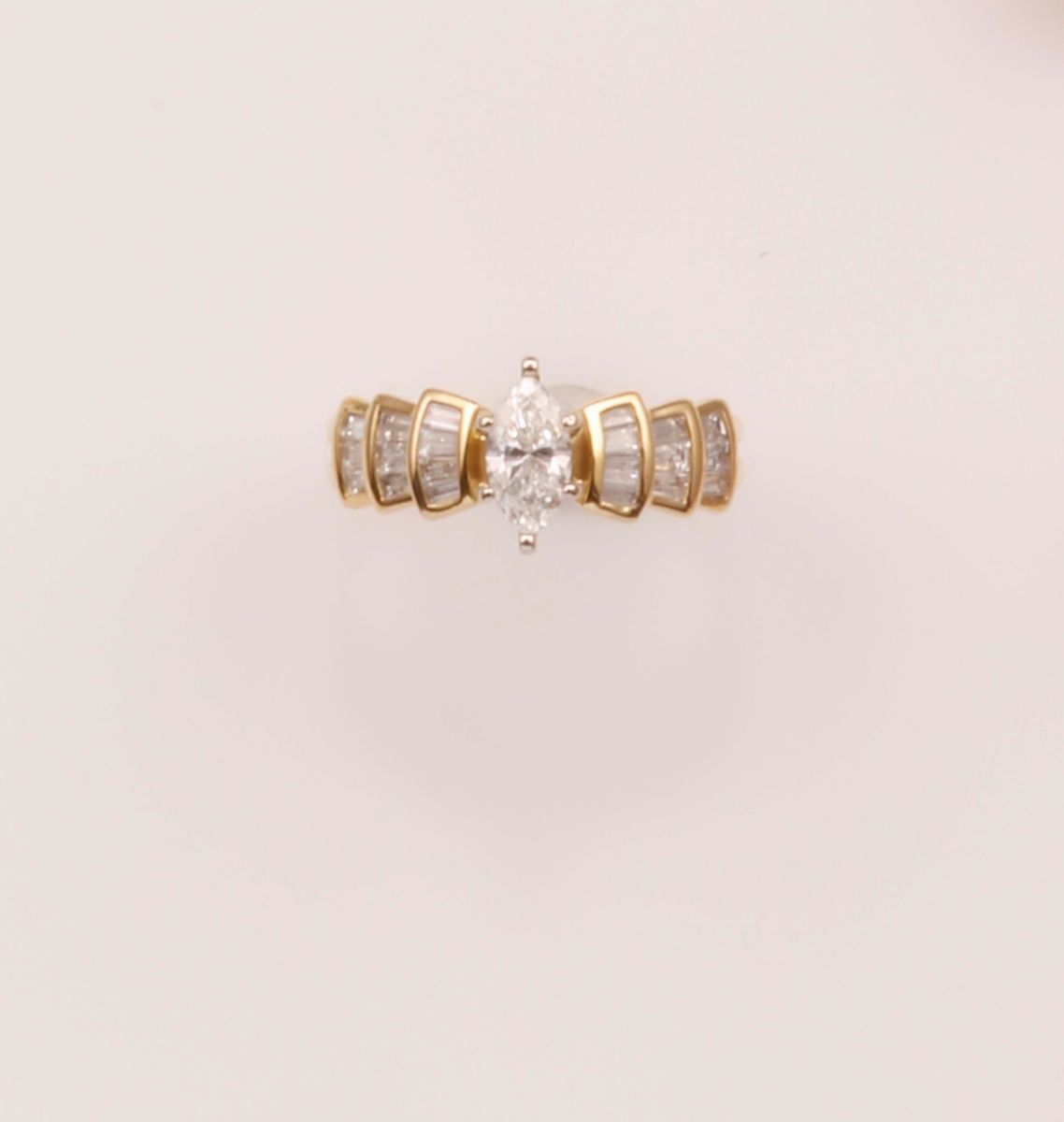 Anello con diamante taglio navette di ct 1,30 circa e diamanti taglio tepper