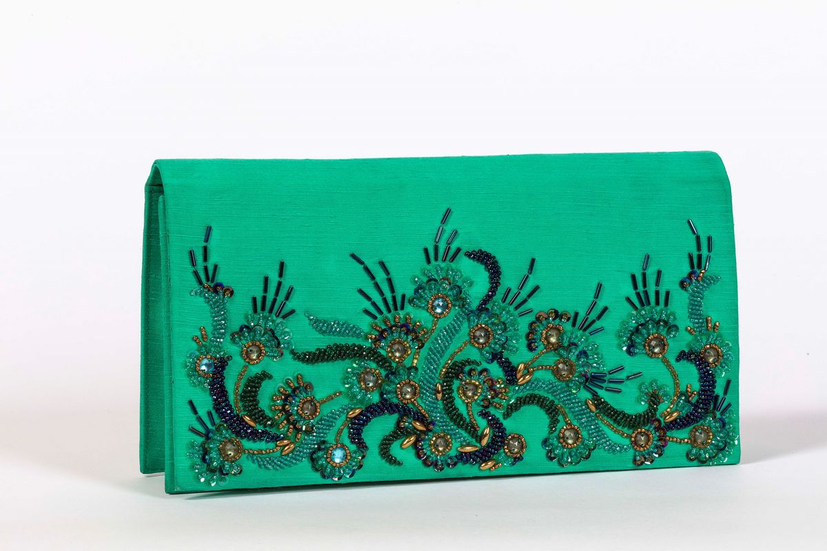 In tessuto, ricamata finemente a mano con perline, interno in seta dorata, cm 25x15, difetti