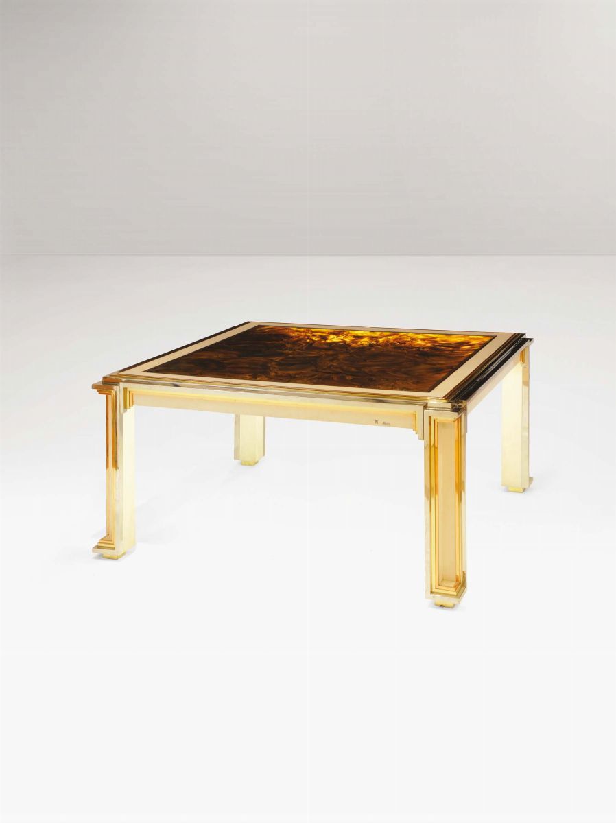 Tavolo laccato con profili in metallo cromato, ottone e rame. Piano retroilluminato in plexiglass. Firmato.