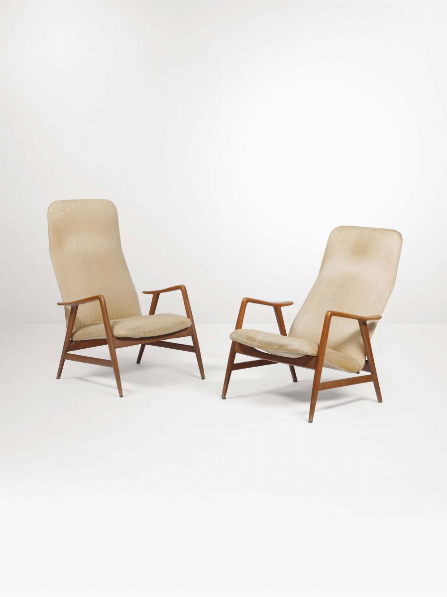 Coppia di poltrone Kontur con struttura in legno e rivestimento in tessuto.