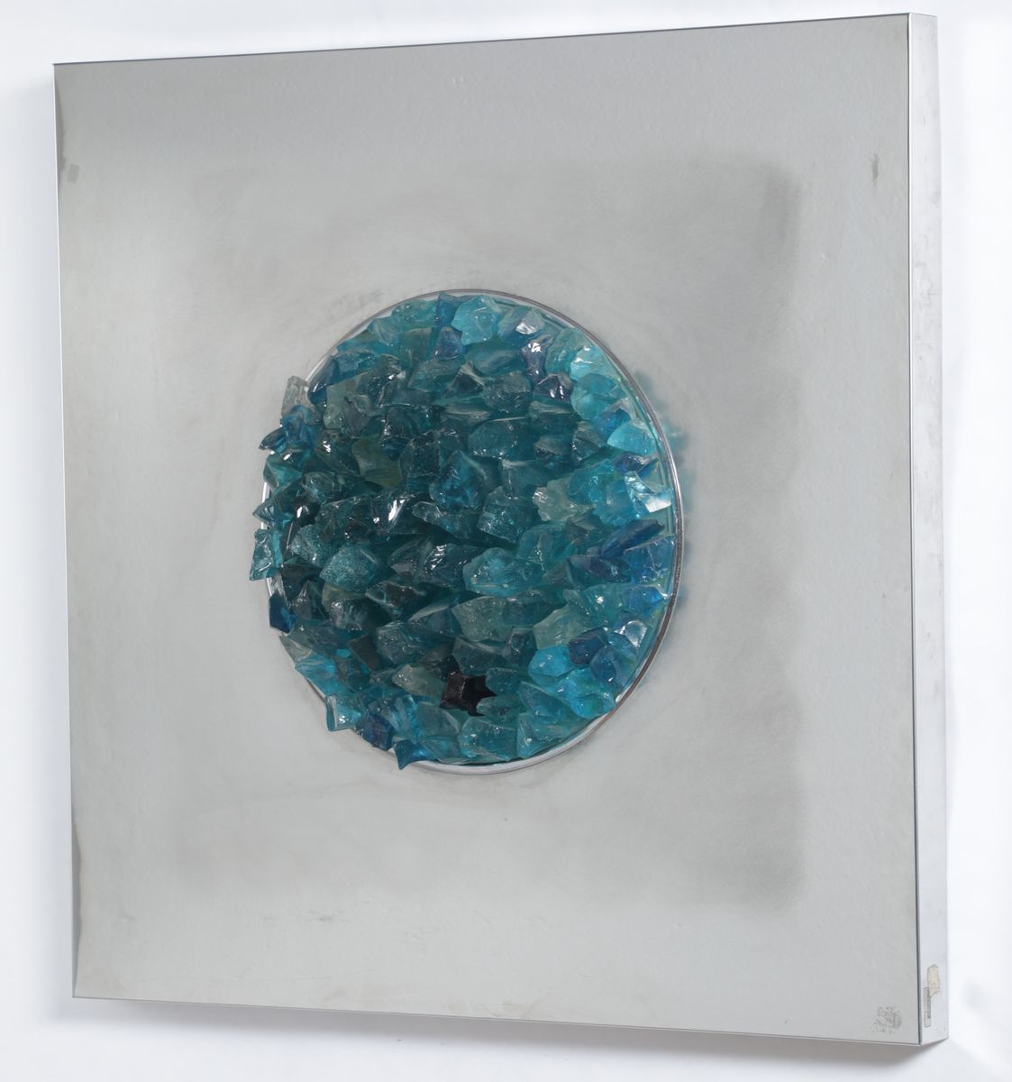 Pannello luminoso Oceano Blu con struttura in legno, metallo e diffusore in cristallo scalpellato. Firma incisa.