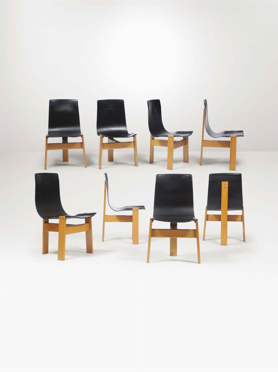 Otto sedie Tre 3 con struttura in legno e seduta in cuoio.