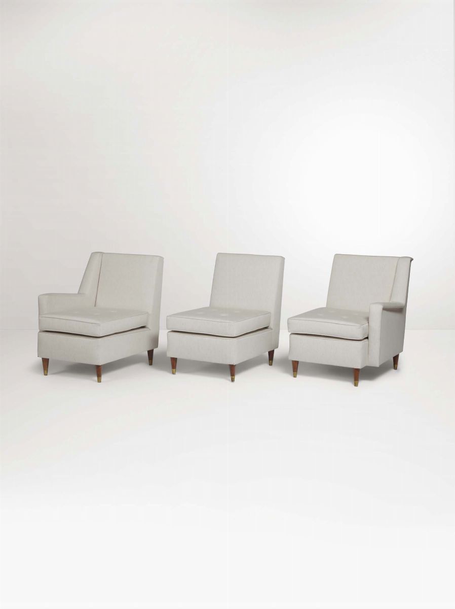 Divano con tre poltrone modulari. Struttura in legno e rivestimenti in tessuto.