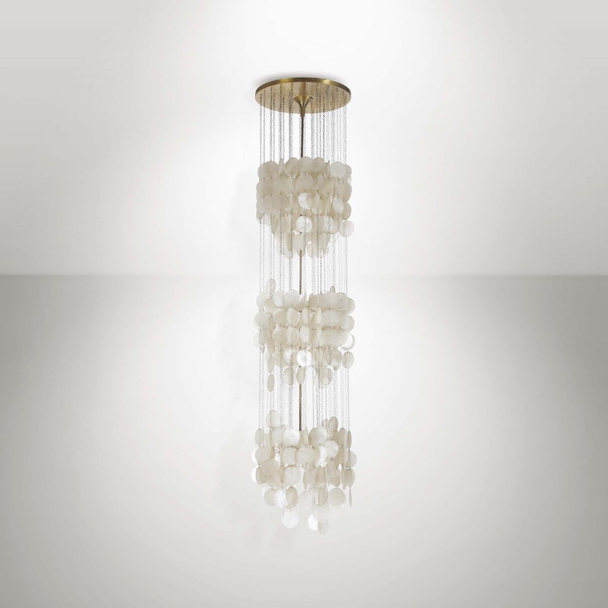 Lampada a sospensione con struttura in metallo ed elementi diffusori in madreperla.